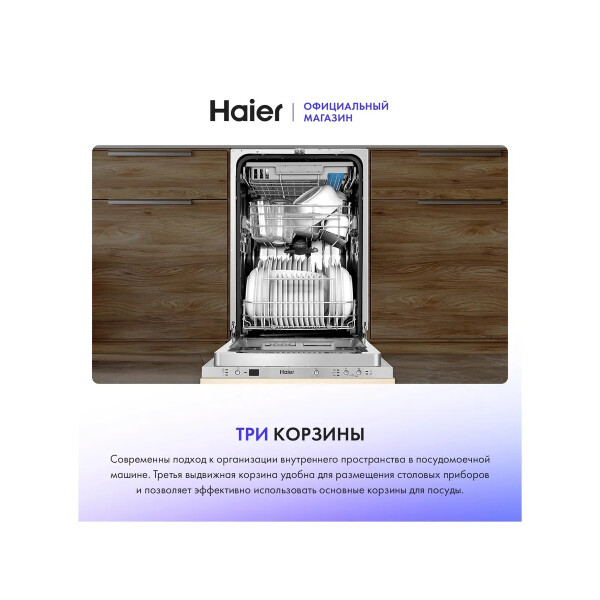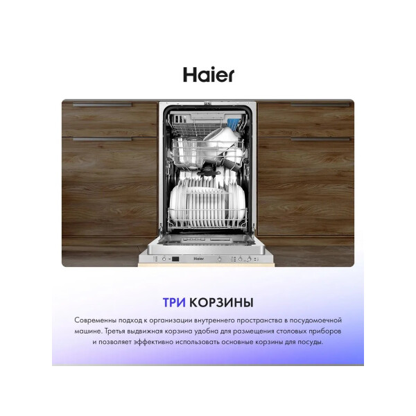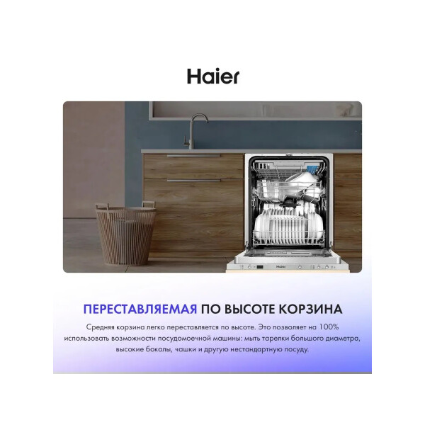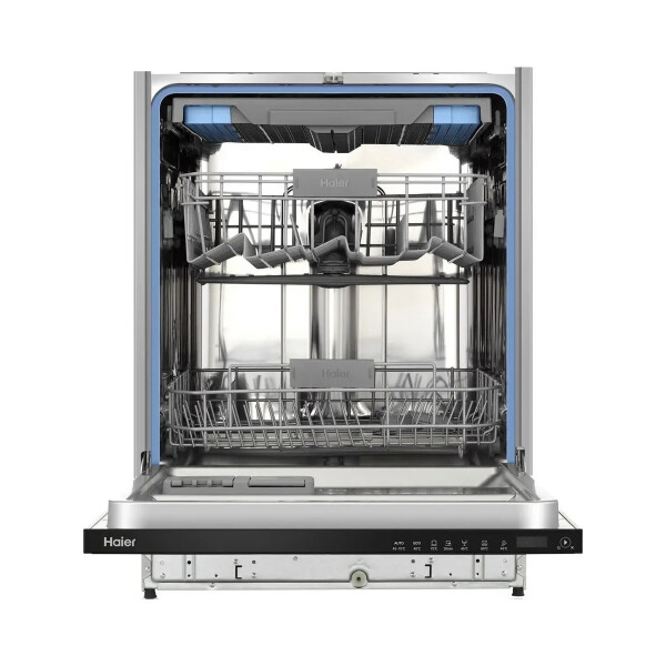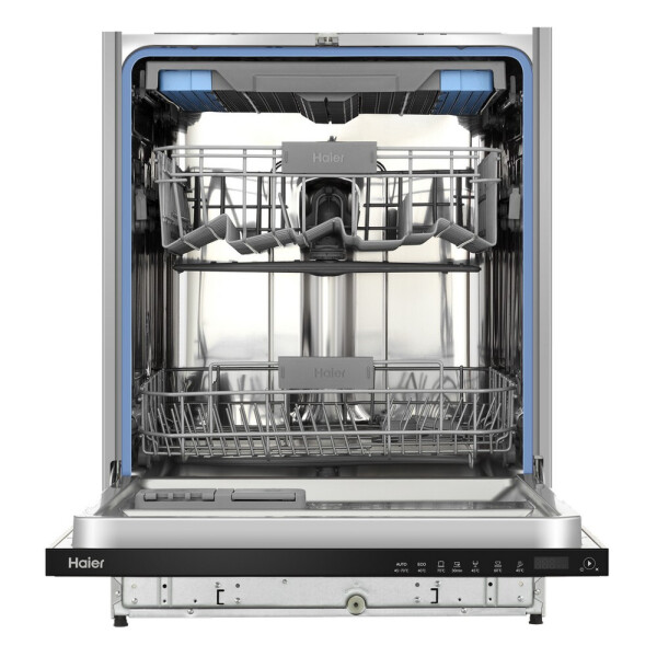 Посудомоечная машина Haier HDWE14-094RU это встраиваемый прибор с классом энергопотребления А, рассчитанный на загрузку до 14 стандартных комплектов посуды. Благодаря такой большой вместимости вы сможете помыть за один цикл всю посуду, например, после торжественного события. При этом в нижней и средней корзине имеются складные держатели. Последнюю можно отрегулировать по высоте, что позволит загружать всю посуду максимально удобно. Верхняя корзина-поднос, которая предназначена для столовых приборов, с легкостью вынимается из прибора.