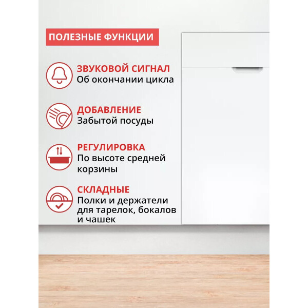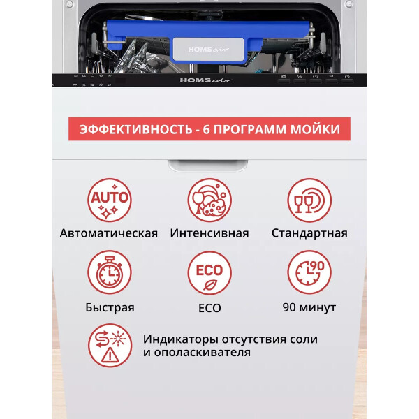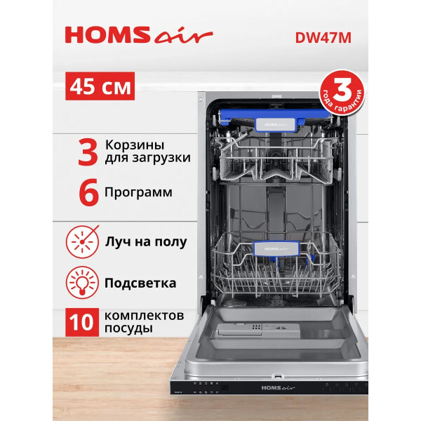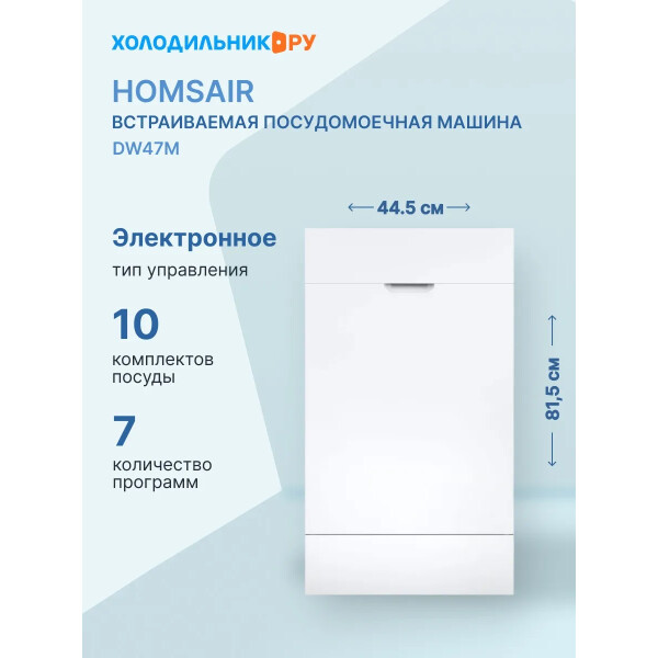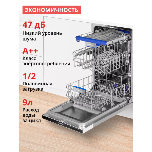 Встраиваемая посудомоечная машина HOMSair DW47M имеет вместимость до 10 комплектов посуды. Модель оснащена интуитивно понятным электронным управлением. Режим половинной загрузки экономит воду и электроэнергию. Система защиты от протечек обеспечивает безопасность эксплуатации.