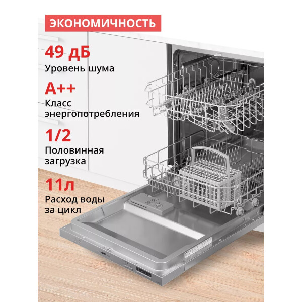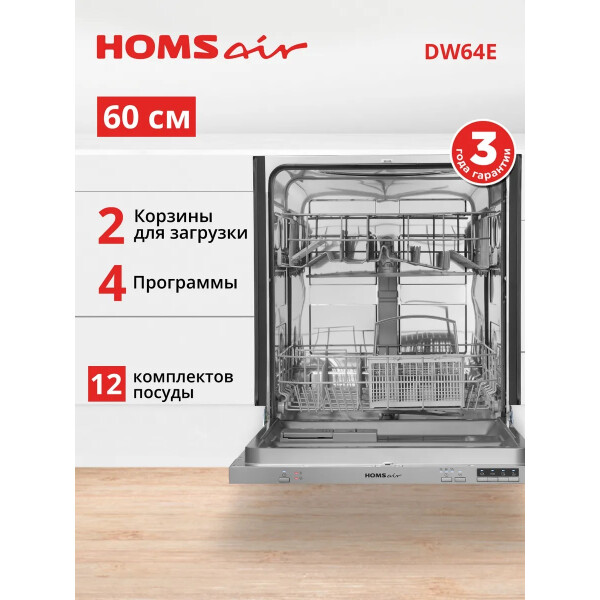 Встраиваемая посудомоечная машина HOMSair DW64E имеет вместимость до 12 комплектов посуды. Модель оснащена интуитивно понятным электронным управлением. Режим половинной загрузки экономит воду и электроэнергию. Система защиты от протечек обеспечивает безопасность эксплуатации.