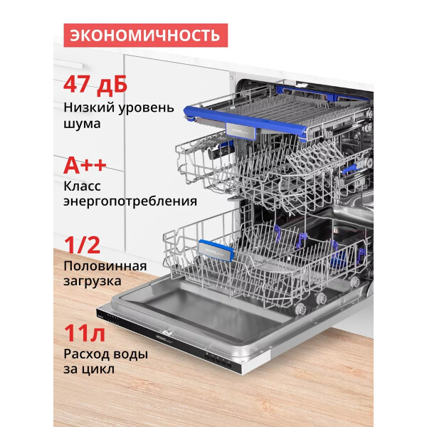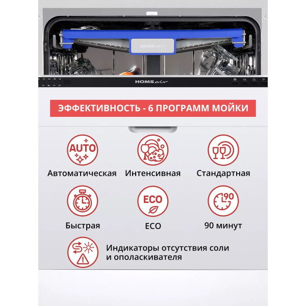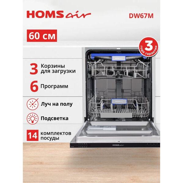 Встраиваемая посудомоечная машина HOMSair DW67M имеет вместимость до 14 комплектов посуды. Модель оснащена интуитивно понятным электронным управлением. Режим половинной загрузки экономит воду и электроэнергию. Система защиты от протечек обеспечивает безопасность эксплуатации.