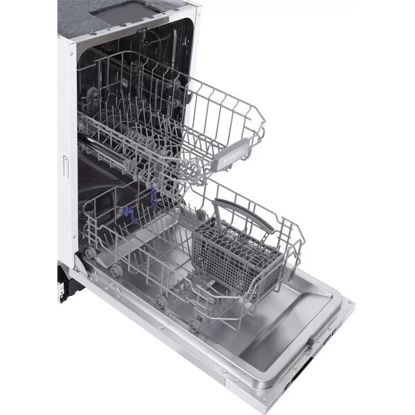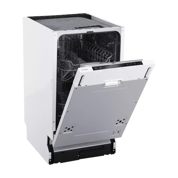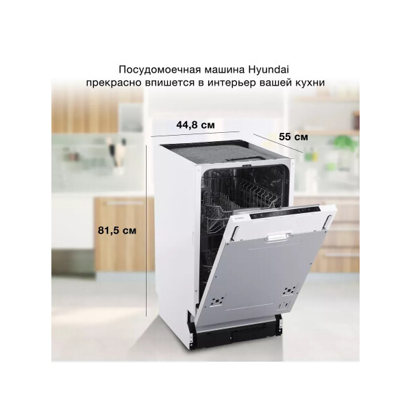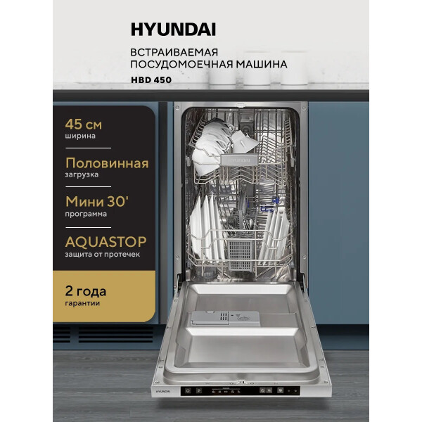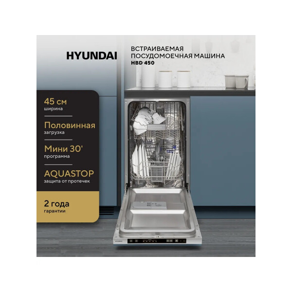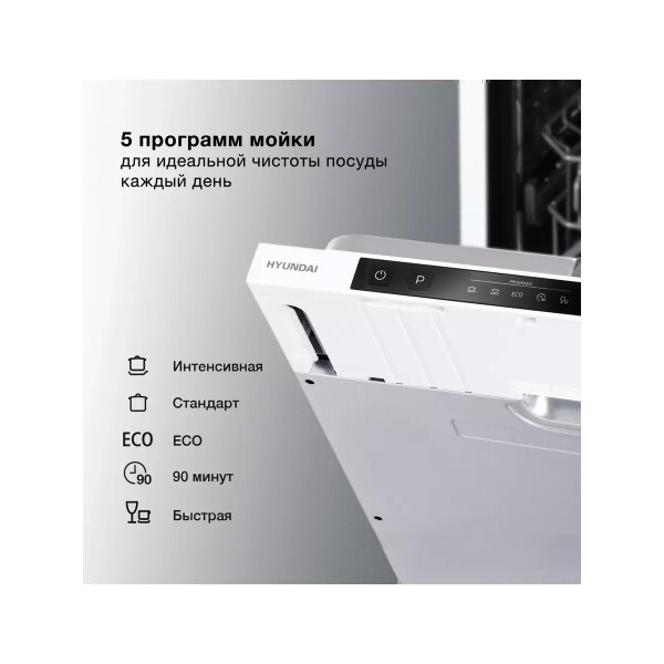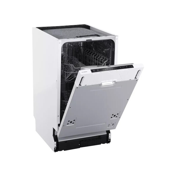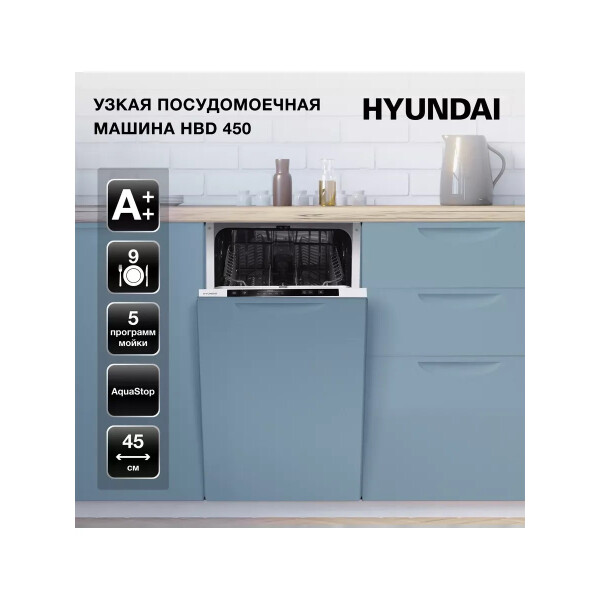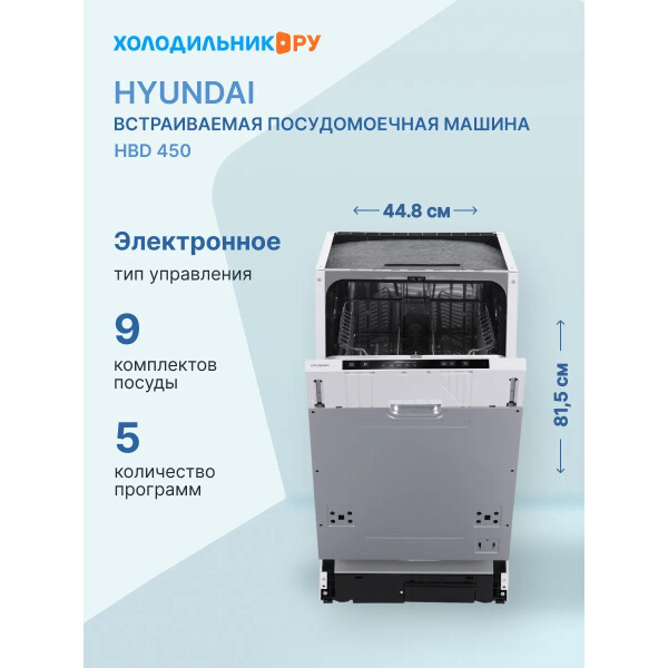 Встраиваемая посудомоечная машина Hyundai HBD 450 вмещает в себя 9 комплектов посуды. 5 программ мойки. Встраивается полностью.