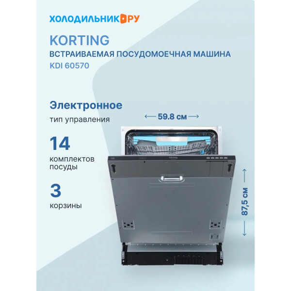 Посудомоечная машина Korting KDI 60570 встраиваемая полноразмерная модель с возможностью загрузки до 14 стандартных комплектов. Прибор оснащен программой Baby Care, дополнительное ополаскивание горячей водой и антимикробное покрытие обеспечивают превосходное качество мытья. Третья корзина позволяет удобно разместить столовые приборы, для удобства в комплекте идет держатель для бокалов на высокой ножке.