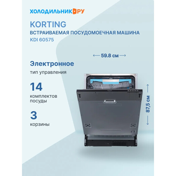 Встраиваемая посудомоечная машина Korting KDI 60575 c удобной системой электронного управления и дисплеем позволит вам с лёгкостью пользоваться этой посудомоечной машиной. Индикатор наличия соли и ополаскивателя всегда подскажет о необходимости пополнения. Класс энергопотребления А++ позволяет расходовать меньше электроэнергии, что экономит ваш бюджет. За одну загрузку вы легко отмоете до 14 комплектов посуды. Внутренняя поверхность рабочей камеры выполнена из нержавеющей стали, что обеспечивает длительной срок службы прибора. Регулируемая по высоте корзина позволит вам мыть даже крупногабаритную посуду. Возможность задавать время начала выполнения программы, отложив старт с момента загрузки посуды и выбора программы мойки на несколько часов. 8 автоматических программ. Режим половинной загрузки поможет вам сэкономить не только воду, но и электроэнергию.