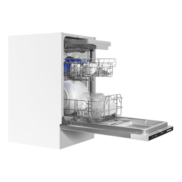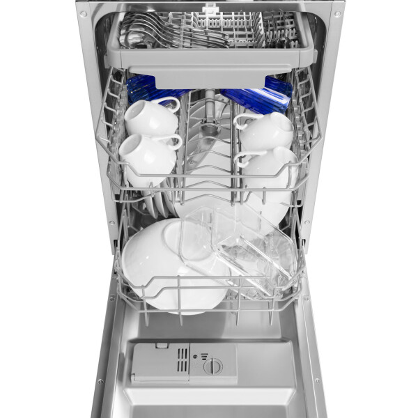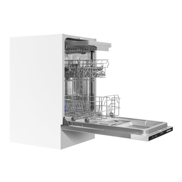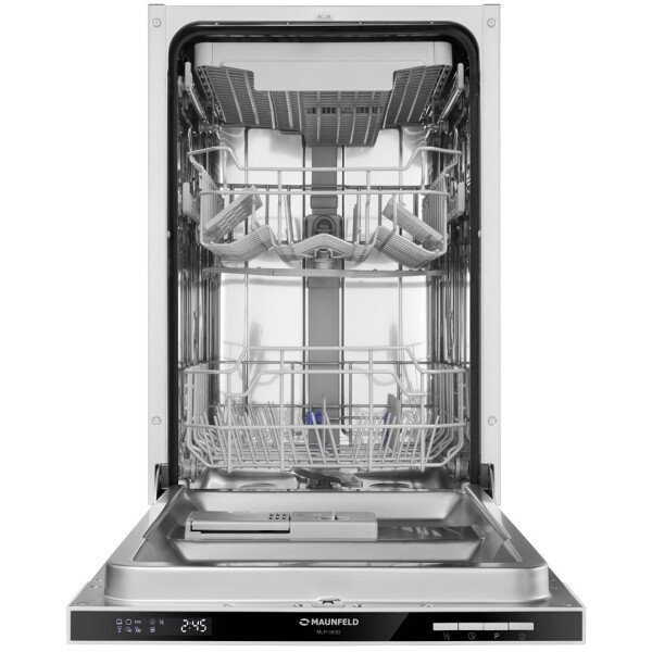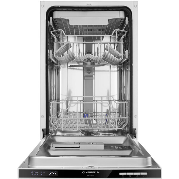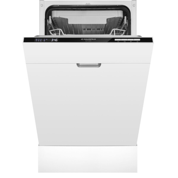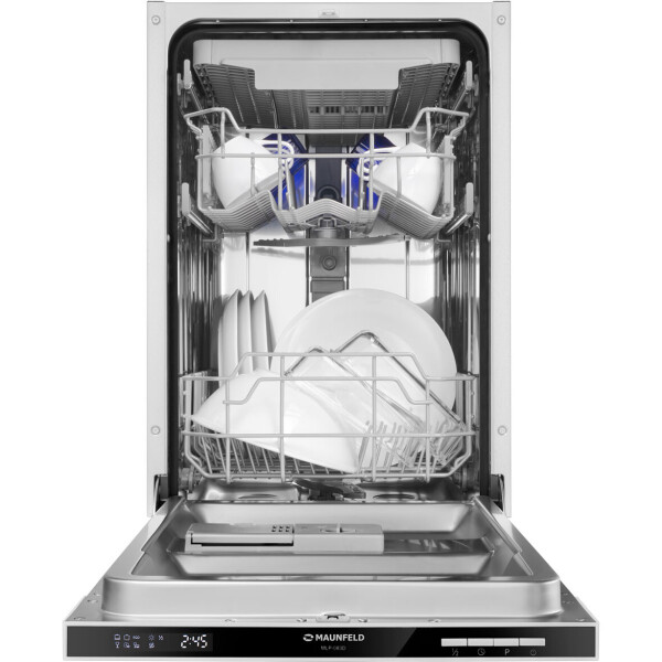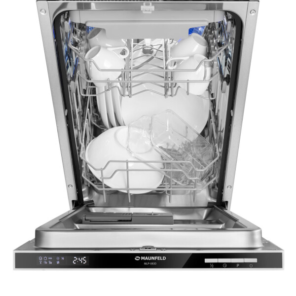 Электронное управление с дисплеем расположено в торце загрузочной дверцы. Функционал данной модели позволяет вам выбрать программу мойки, включить половинную загрузку, выставить время отсрочки старта (1-24 часов).