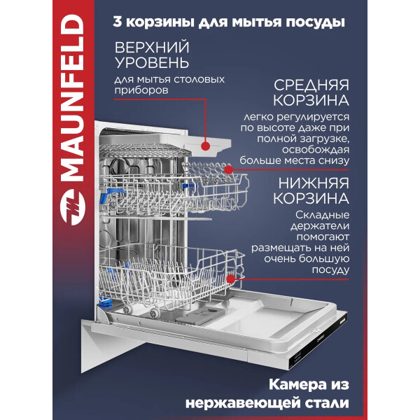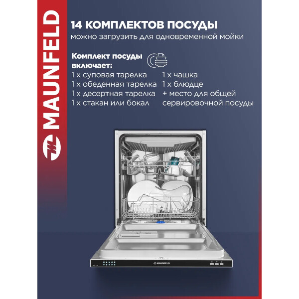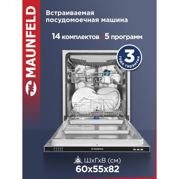 Полноразмерная встраиваемая посудомоечная машина шириной 60 см на 14 комплектов посуды. Внутренняя поверхность выполнена из нержавеющей стали толщиной 0.6-0.8 мм, что обеспечит долгий срок службы при активном использовании.