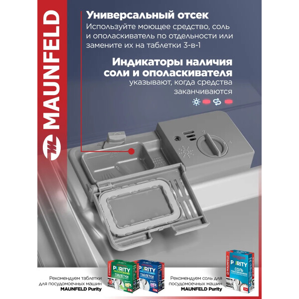 позволяют контролировать наличие соли и ополаскивателя. Звуковой сигнал оповещает о завершении работы. Предусмотрена надежная защита от протечек.