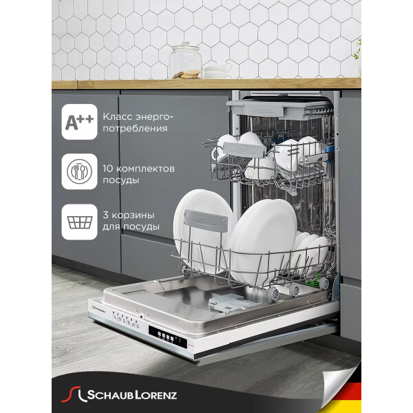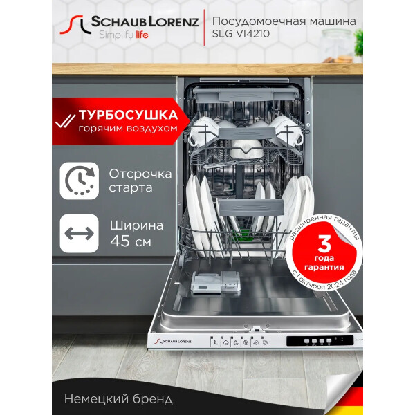 Посудомоечная машина SLG VI4210 относится к категории узких встраиваемых моделей. Её ширина 45 см, что позволяет устанавливать ее в любом месте, максимально эргономично используя свободное кухонное пространство.