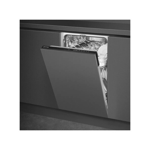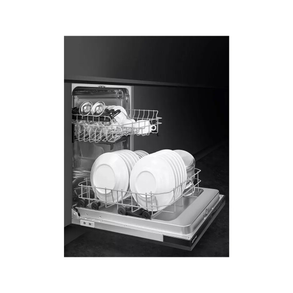 Посудомоечная машина Smeg ST4522IN компактная встраиваемая модель. Несмотря на ширину в 45 см, она вмещает до 9 стандартных комплектов посуды. Корзины регулируются по высоте и имеют фиксированные держатели, что обеспечивает возможность размещения крупногабаритных и нестандартных предметов.