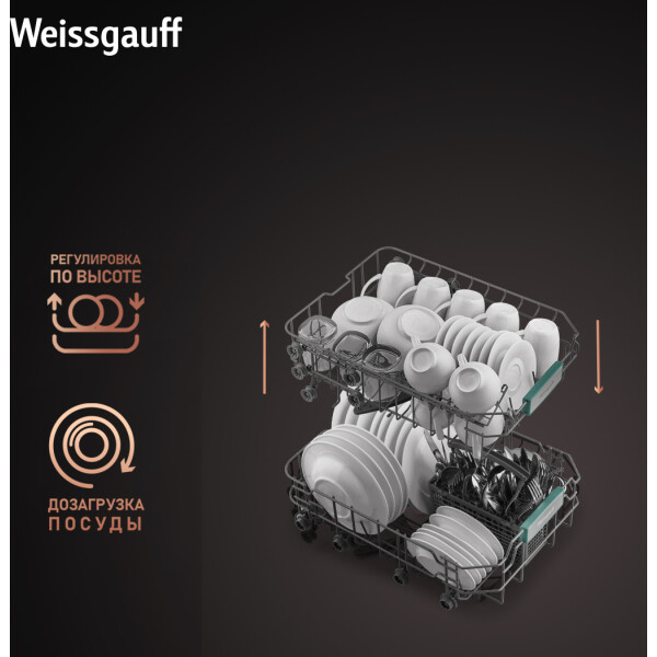 Если вам надоело заполнять отсеки для моющего средства, соли и ополаскивателя, то функция использования моющих средств Всё в 1 избавит вас от этой рутинной необходимости. Просто поместите таблетку 3 в 1 в специальный отсек, а все остальное за вас сделает ваша посудомоечная машина Weissgauff.