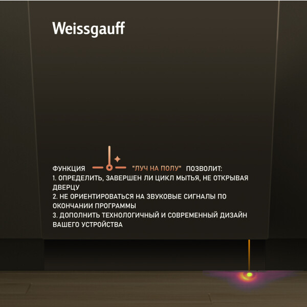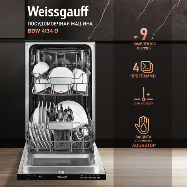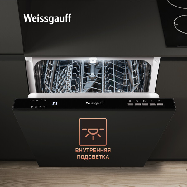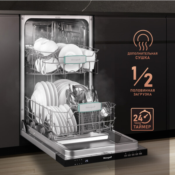 Компактная и экономичная посудомоечная машина Weissgauff обладает всеми необходимыми функциями для идеального результата после каждого рабочего цикла загрузки. 2 уровня разбрызгивателей воды S-образной формы обеспечивают наилучшее качество мытья, а встроенная подсветка мягкого синего цвета не только позволит видеть сразу весь объем загруженной посуды, но и добавит эстетики, присоединяющей свои нотки красоты в общий дизайн вашей кухни.