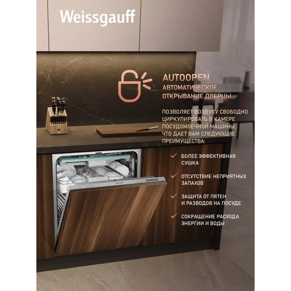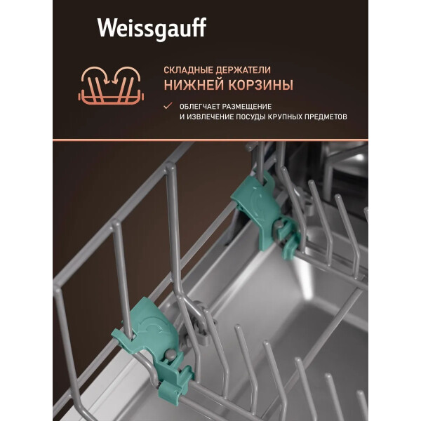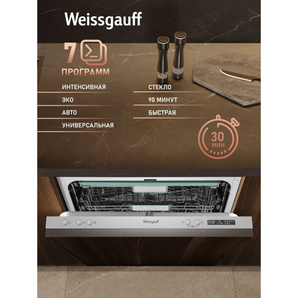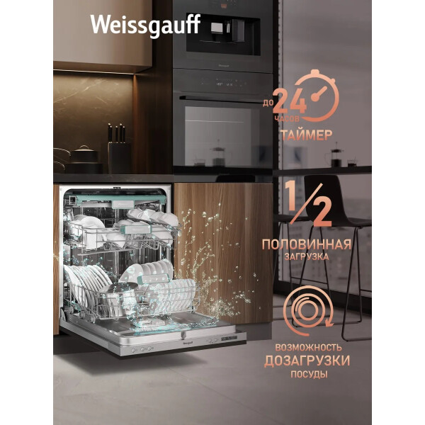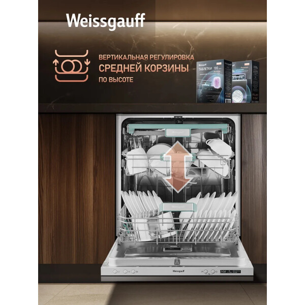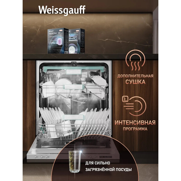 Если вам надоело заполнять отсеки для моющего средства, соли и ополаскивателя, то функция использования моющих средств Всё в 1 избавит вас от этой рутинной необходимости. Просто поместите таблетку 3 в 1 в специальный отсек, а все остальное за вас сделает ваша посудомоечная машина Weissgauff.