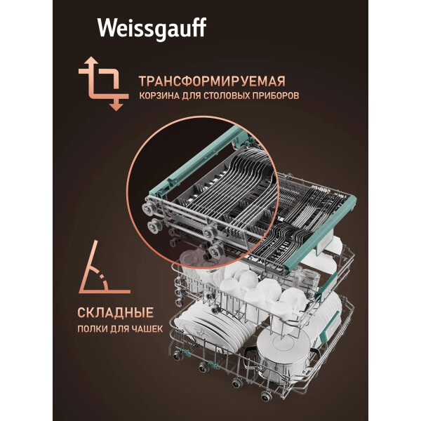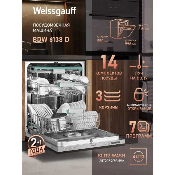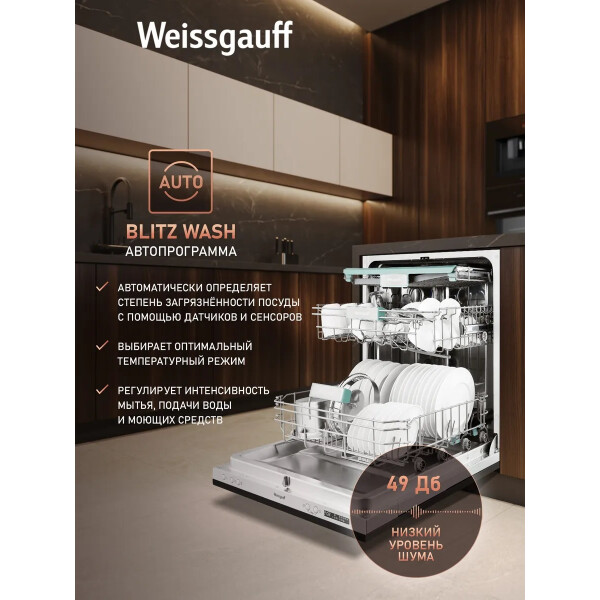 Полноразмерная посудомоечная машина Weissgauff шириной 60 см, рассчитанная на 14 комплектов посуды, не только отлично будет смотреться на вашей кухне, но и обеспечит идеальный результат: 3 корзины позволят расположить посуду оптимальным образом для достижения наилучшего качества мытья, а наличие автопрограммы позволит машине самостоятельно определить количество посуды, степень загрязнения, время мойки, а также необходимую температуру.