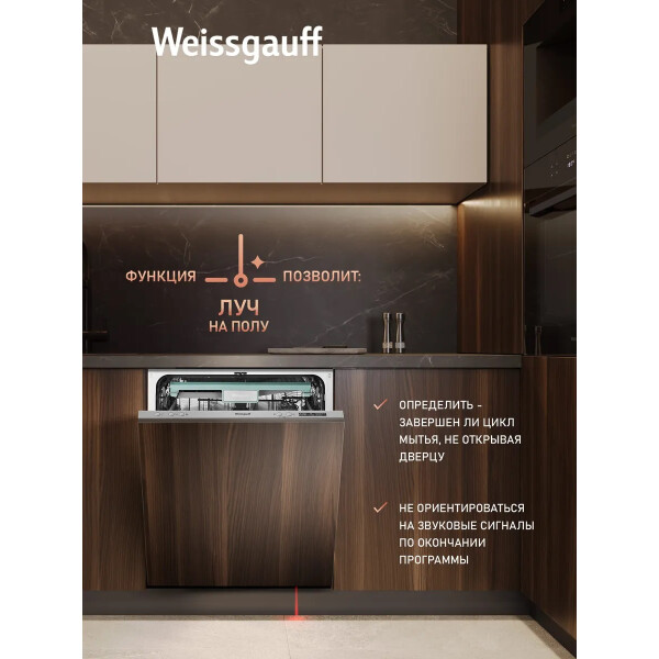 Поскольку посудомоечные машины Weissgauff очень бесшумны, полезно иметь возможность узнать, когда же цикл мойки посуды завершён, не открывая при этом дверцу и не заглядывая внутрь камеры. Яркая красная точка будет сигнализировать о том, что процесс работы еще продолжается, и автоматически погаснет после окончания цикла.