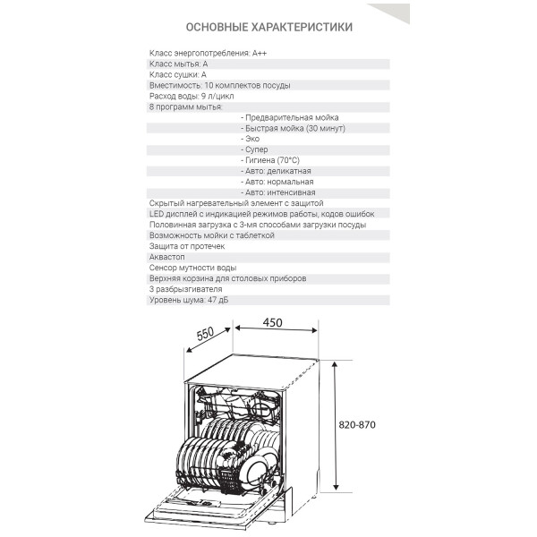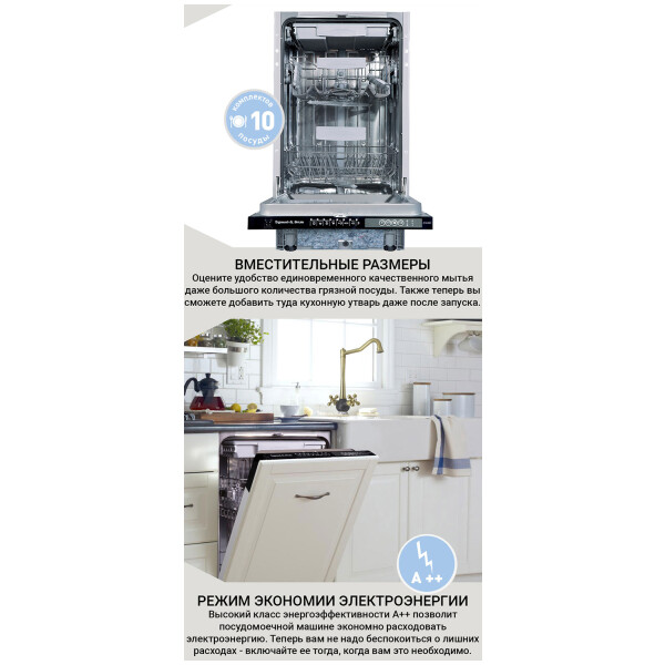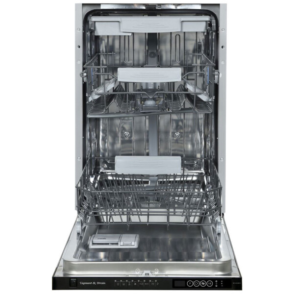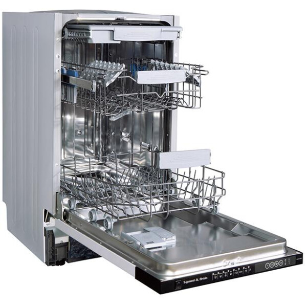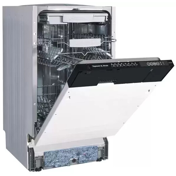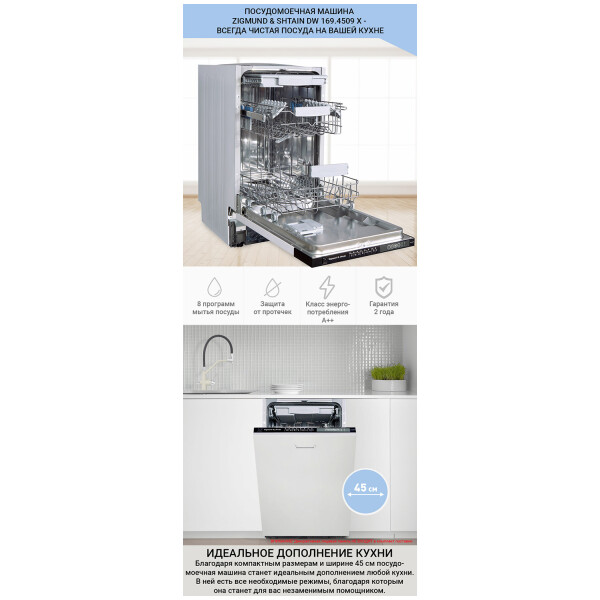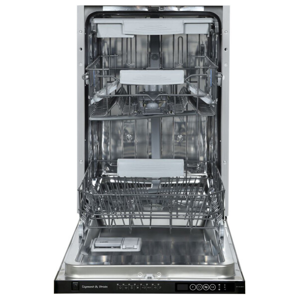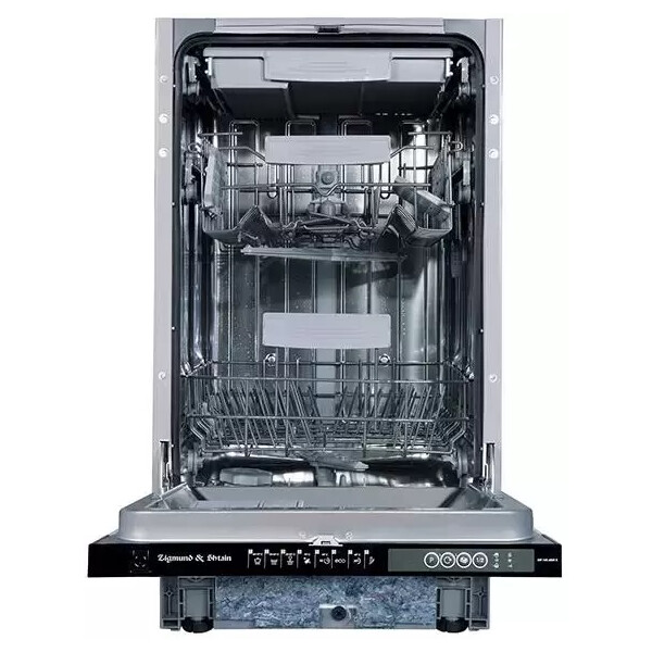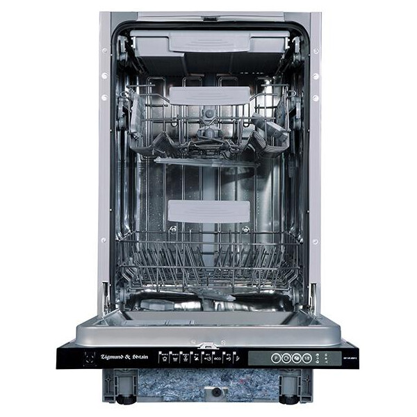 При ширине 45 см, полностью встраиваемая посудомоечная машина «Zigmund Shtain DW 169.4509 X»» справляется с мытьем 10 комплектов посуды. Один комплект посуды состоит из 3 тарелок (суповой, десертной и тарелки для второго блюда), бокала, чашки, блюдца, 3 ложки (столовая, десертная, чайная), нож, вилка. В арсенале этой модели 9 программы мойки, среди которых имеется 3 авто-программы, которые самостоятельно выбирают все необходимые параметры мойки, в зависимости от количества и степени загрязненности посуды, а работающий при этом аква-сенсор отслеживает чистоту воды в машине и контролирует время мойки, необходимое для отличного результата. Функция ½ загрузки в данной модели работает в 3 режимах: с помощью кнопки можно выбрать один из трёх, при этом посуда может находиться в верхнем или нижнем коробе, или же в обоих коробах. Индикация нехватки соли и ополаскивателя даст вовремя знать о том, что эти компоненты необходимо добавить. Отложенный старт позволит запустить мойку позже ( до 19 часов), если к примеру, ночные тарифы ниже, что позволит Вам получить чистую посуду, затратив при этом меньше денег. Ширина посудомоечной машины составляет 45 см, что позволит установить её в кухнях стандартных и небольших размеров. Модель оснащена полной защитой от протечек.
