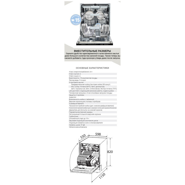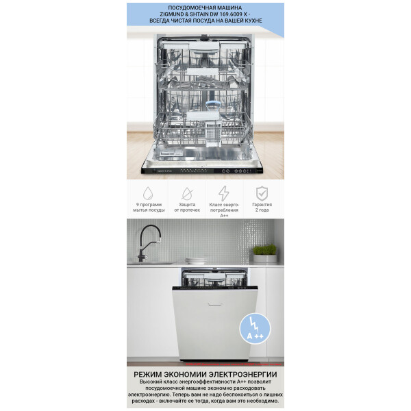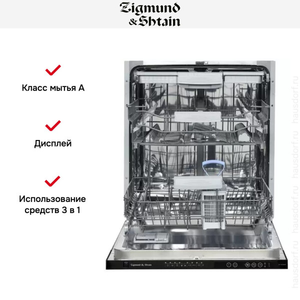 При ширине 60 см, полностью встраиваемая посудомоечная машина Zigmund Shtain DW 169.6009 X справляется с мытьем 15 (!) комплектов посуды. Один комплект посуды состоит из 3 тарелок (суповой, десертной и тарелки для второго блюда), бокала, чашки, блюдца, 3 ложки (столовая, десертная, чайная), нож, вилка. В арсенале этой модели 9 программы мойки, среди которых имеется 3 авто-программы, которые самостоятельно выбирают все необходимые параметры мойки, в зависимости от количества и степени загрязненности посуды, а работающий при этом аква-сенсор отслеживает чистоту воды в машине и контролирует время мойки, необходимое для отличного результата. Функция загрузки в данной модели работает в 3 режимах: с помощью кнопки можно выбрать один из трёх, при этом посуда может находиться в верхнем или нижнем коробе, или же в обоих коробах. Индикация нехватки соли и ополаскивателя даст вовремя знать о том, что эти компоненты необходимо добавить. Отложенный старт позволит запустить мойку позже ( до 19 часов), если к примеру, ночные тарифы ниже, что позволит Вам получить чистую посуду, затратив при этом меньше денег. Внутреннее LED освещение поможет Вам оценить качество мытья посуды не вынимая её, сразу после мойки. Так же реализованы разработки в мытье посуды: технология тройной мойки (снизу стоят дополнительные сопла) позволяет лучше промывать кастрюли, технология прямой мойки - на верхней корзине стоят доп.сопла для лучшего промывания бокалов/кружек. Приятная опция для Вас держатель для бутылок/банок на нижней корзине. Ширина посудомоечной машины составляет 59.8 см, что позволит установить её в кухнях стандартных размеров. Модель оснащена полной защитой от протечек.