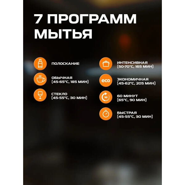 Прибор оснащен семью программами разных видов моек, а так же обладает надежной защитой от протекания.