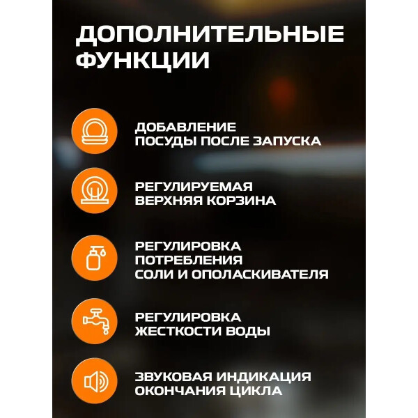Машина вмещает до 11 полных наборов посуды и расходует 9 л воды за 1 цикл.
