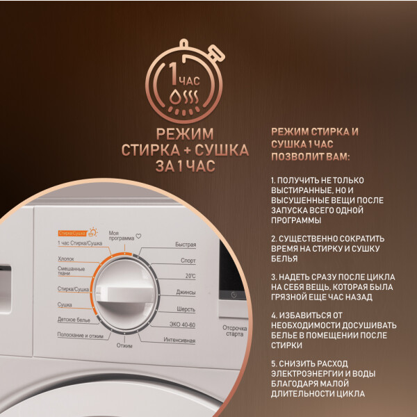 Быстрый режим Стирка + Сушка за 1 час - подходит для ситуаций, когда вам за короткое время необходимо получить чистые и сухие вещи.