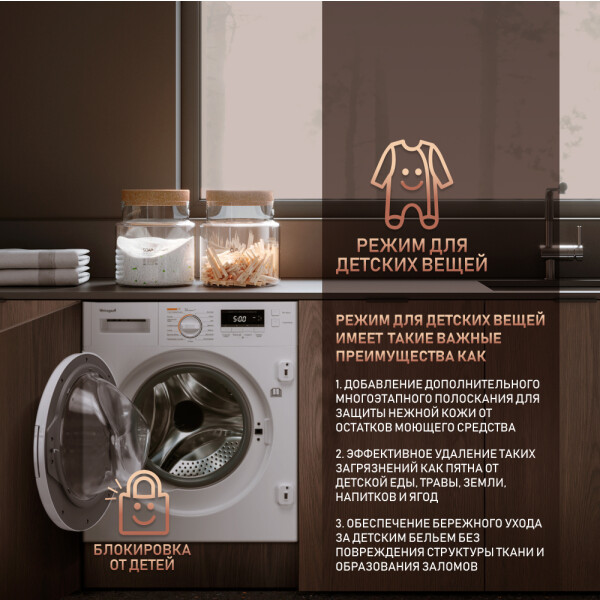Режим для детских вещей добавляет дополнительное полоскание, что особо важно при защите нежной кожи от остатков моющего средства.