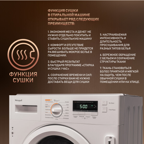 Предложенная модель - это полноценный гибрид стиральной и сушильной машины "2 в 1". При этом, вам не потребуется выделять дополнительное место, ведь процесс сушки будет происходить прямо в устройстве. Помимо этого, функция сушки здорово экономит время и снижает общую влажность в помещении. Со стиральной машиной Weissgauff вам больше не придётся долго ждать, пока вещи высохнут - ведь вы можете отправлять в сушку до 6 килограммов белья за один раз. И забудьте о необходимости развешивать бельё в квартире или устанавливать объёмистые и громоздкие сушилки!