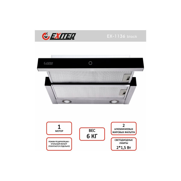 Угольный фильтр приобретается отдельно. Декоративная ручка из чёрного стекла. Диаметр воздухоотвода: 150 мм. Режимы работы: отвод/рециркуляция.