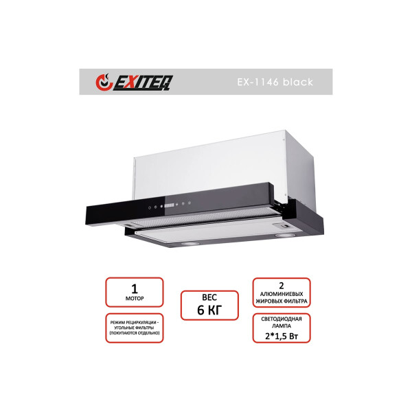 Встраиваемая вытяжка Exiteq EX-1146 black отлично вписывается в практически любой дизайн кухни одна из лучших вытяжек, по мнению дизайнеров. Яркий светодиодный дисплей, цветная подсветка индикаторов, пульт ДУ. Сенсорное управление 3-мя уровнями скорости всасывания. Режим AutoCerebral: датчики дыма, пара и температуры.