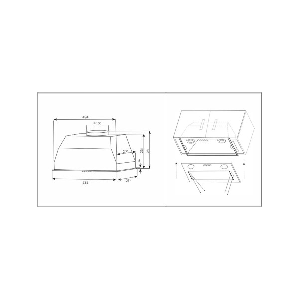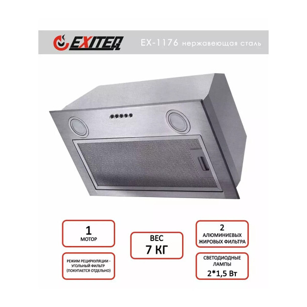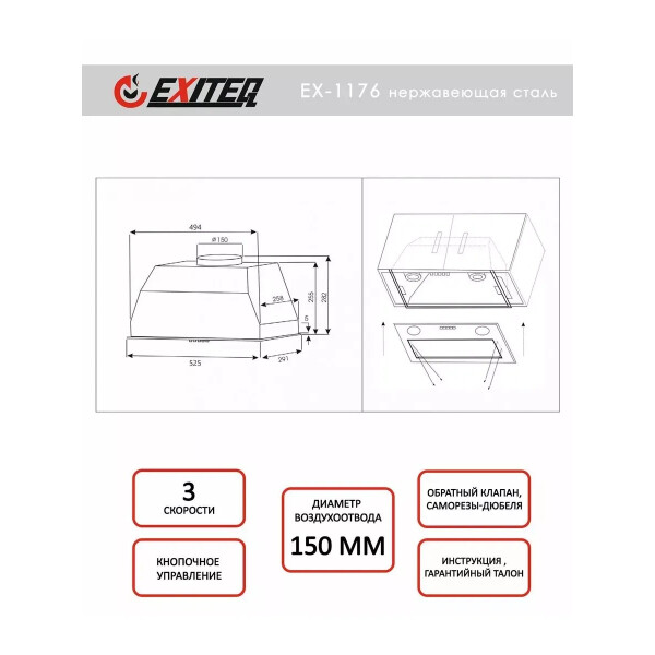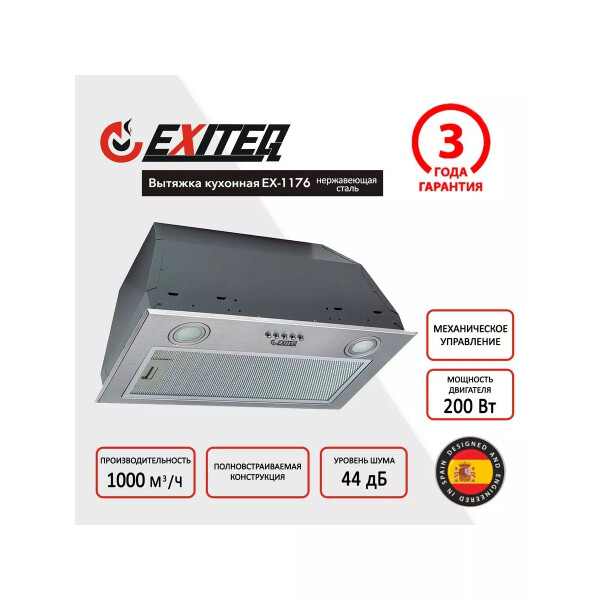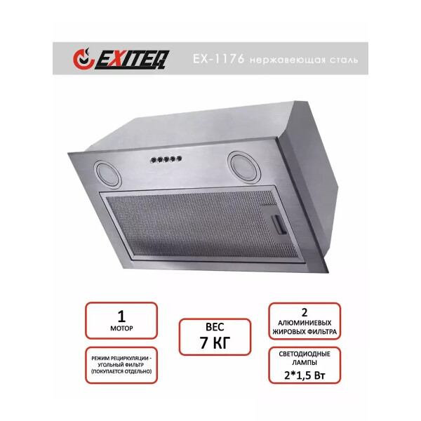 Вытяжка Exiteq EX-1176 это компактная модель с высокой производительностью. Оборудование имеет встраиваемую конструкцию: после установки основная ее часть прячется в навесном шкафчике (на виду остается только панель управления и нижняя часть).