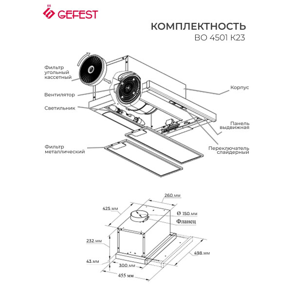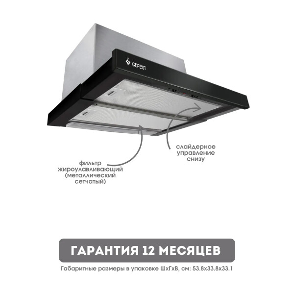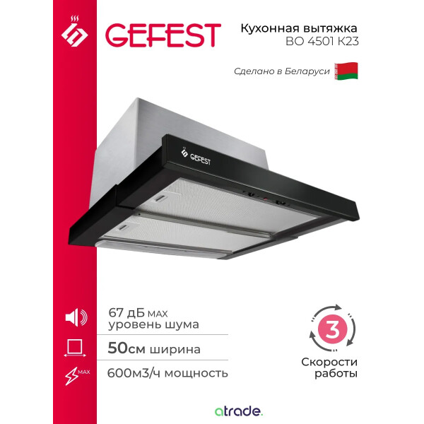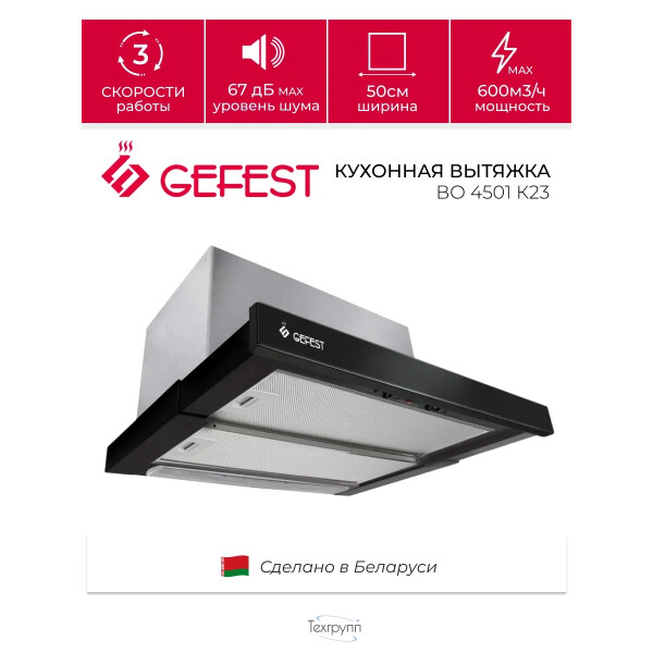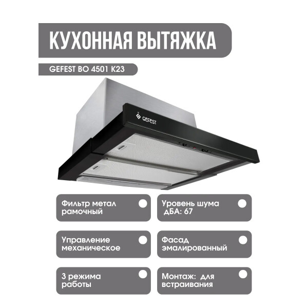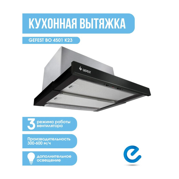 GEFEST ВО 4501 К23 данная модель имеет 3 режима работы, что идеально для приготовления различных блюд. Например, когда готовятся несколько блюд одновременно, стоит включить максимальную скорость, то есть третий режим, а при приготовлении омлета или каши установите свою вытяжку на среднюю или минимальную скорость. Управление вытяжкой происходит при помощи ползункового переключателя.