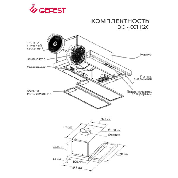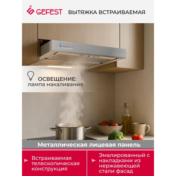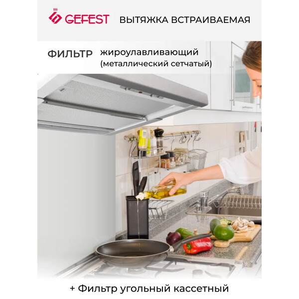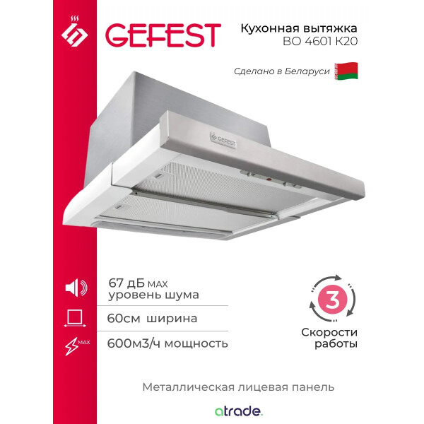 Вытяжка GEFEST ВО 4601 К20 - воздухоочиститель электрический бытовой. Эффективно помогает снизить загрязнение стен, потолков и мебели жировыми частицами, сажей, копотью в процессе приготовления пищи. Он относится к приборам, работающим под надзором, и эксплуатируется как в вытяжном режиме, так и в циркуляционном (очищенный воздух возвращается в помещение кухни). Для работы воздухоочистителя в вытяжном режиме выводную трубу подсоединяют к вентиляционному каналу. Для работы воздухоочистителя в циркуляционном режиме труба выводится за пределы шкафчика. Включение / выключение прибора производится при помощи слайдерного переключателя.