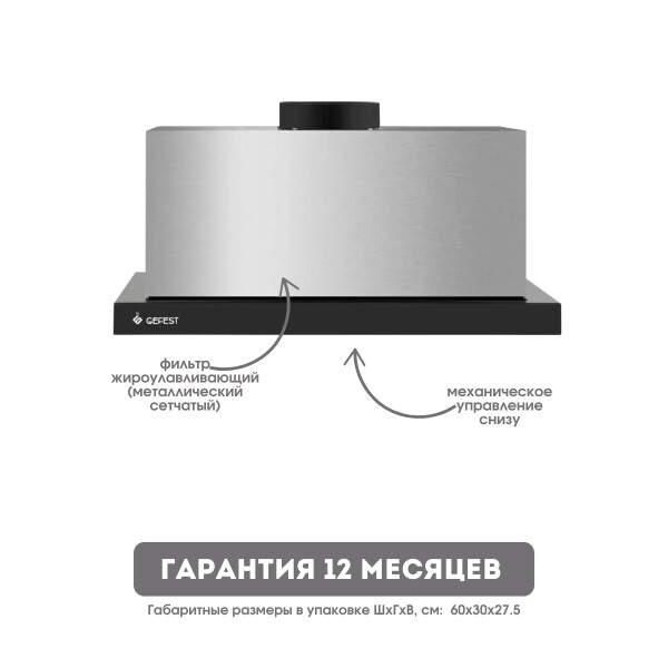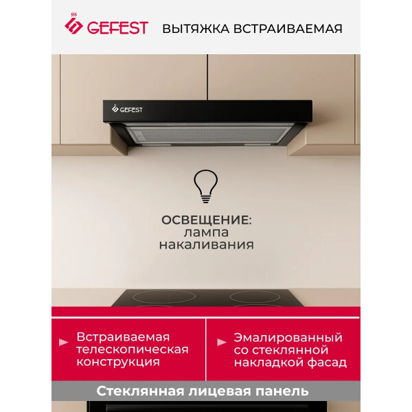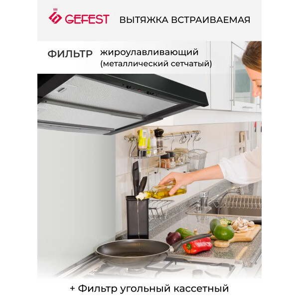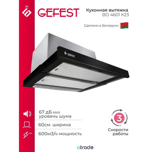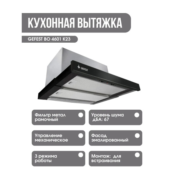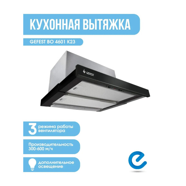 GEFEST ВО 4601 К23 данная модель имеет 3 режима работы, что идеально для приготовления различных блюд. Например, когда готовятся несколько блюд одновременно, стоит включить максимальную скорость, то есть третий режим, а при приготовлении омлета или каши установите свою вытяжку на среднюю или минимальную скорость. Управление вытяжкой происходит при помощи ползункового переключателя.