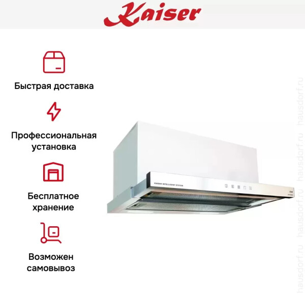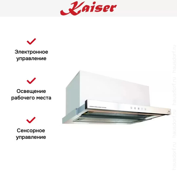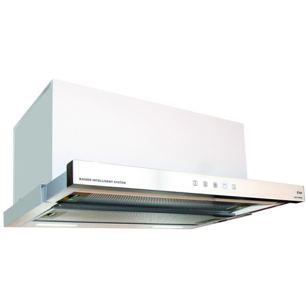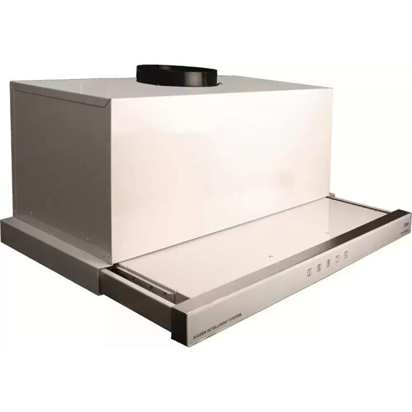 Вытяжка EA 644 W Eco встраивается в шкаф, управление производится при помощи сенсорной панели Full touch и LСD дисплея, которые расположены на выдвижной панели. Прикосновением к сенсору можно выбрать одну из трех скоростей, включить освещение, установить таймер.