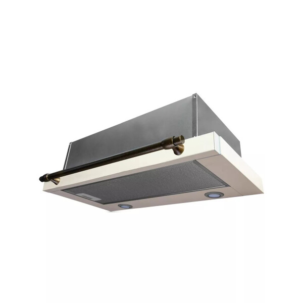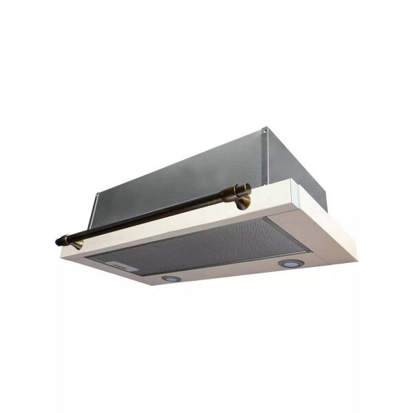 Встраиваемая вытяжка Korting KHP 6617 RB цвета слоновой кости выполнена в ретро-стиле. Бронзовый рейлинг находится на выдвижной панели, за которой спрятаны клавиши переключения режимов. Две светодиодные лампы ярко освещают поверхность, срок службы 50 000 и более часов. Прибор отличается низким уровнем шума.