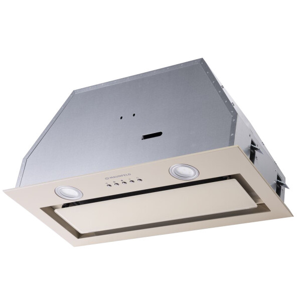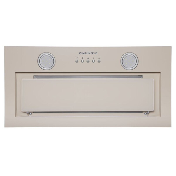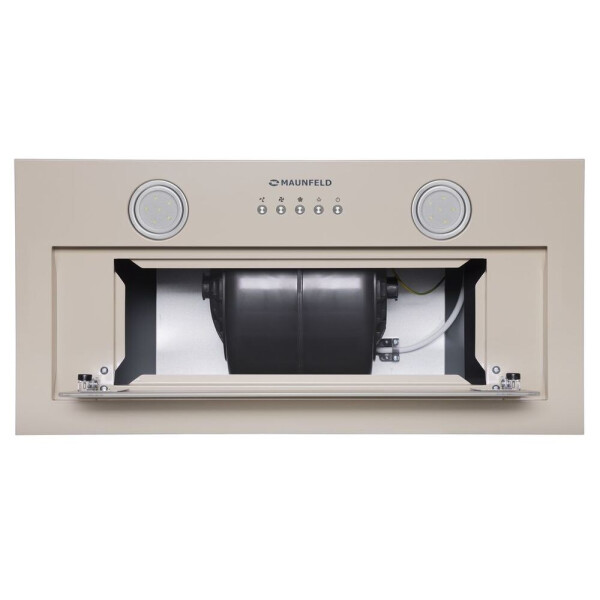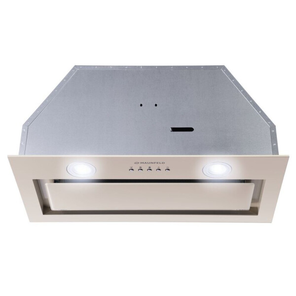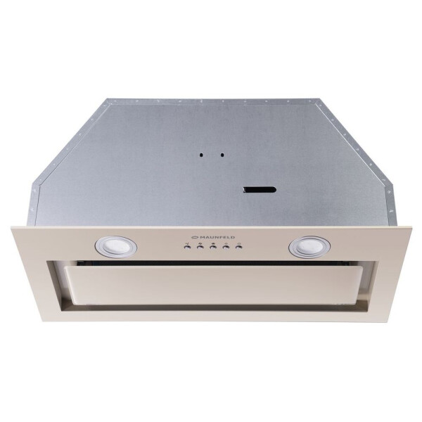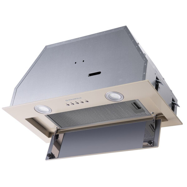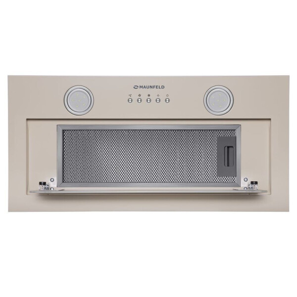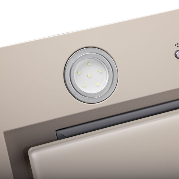 Фронтальная панель выполнена из нержавеющей стали с высококачественным покрытием бежевого цвета. За откидной панелью из глянцевого закаленного стекла находится многослойный жироулавливающий фильтр, который легко вынимается и полностью разбирается, что сильно упрощает чистку.