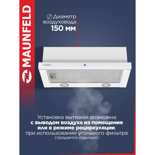 Встраивается в навесной шкаф над варочной поверхностью. Работает в двух режимах отвода (при подключении к системе вентиляции) и рециркуляции (при использовании сменного угольного фильтра).