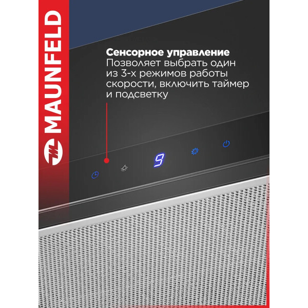 Управление вытяжкой осуществляется с помощью сенсорной панели второго поколения. Вы можете выбрать одну из 3-х скоростей вентилятора и включить освещение (2 светодиодных источника по 1 Вт).