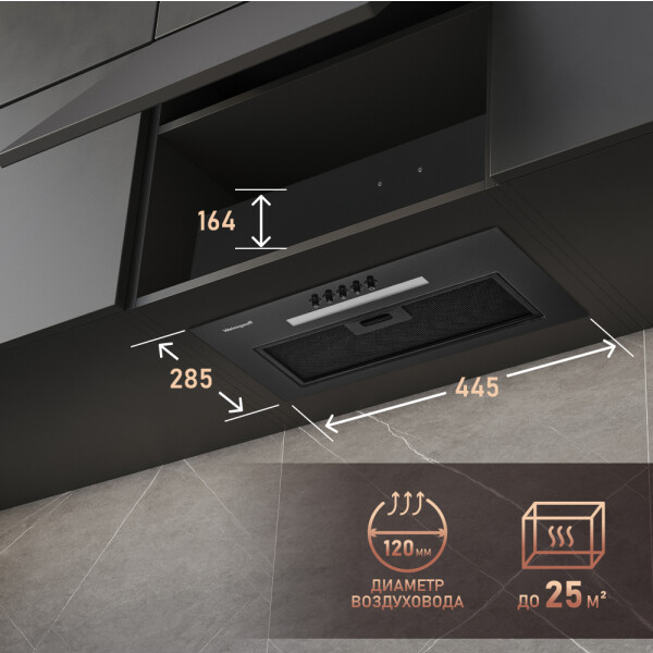 Эффективная работа в помещении площадью до 25 м2 - это гарантия того, что после установки вытяжки Weissgauff, обновление воздуха будет соответствовать всем требуемым нормам, сохраняя ваше здоровье на долгие годы!