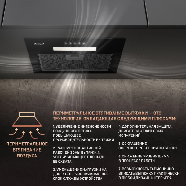 Периметральное всасывание - это технология, которая позволяет вытяжке достигать более высокой интенсивности поглощения воздуха при сохранении низкого уровня энергопотребления