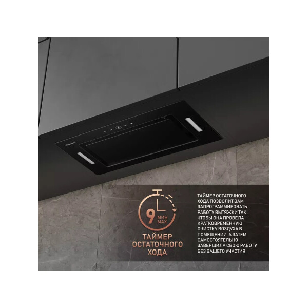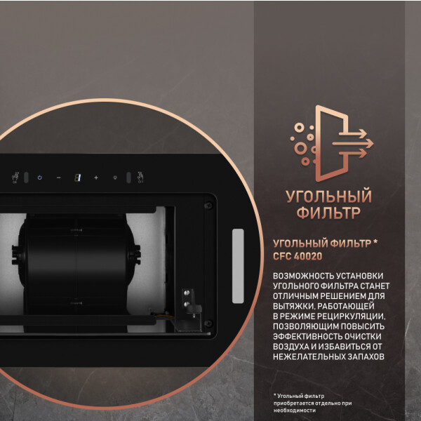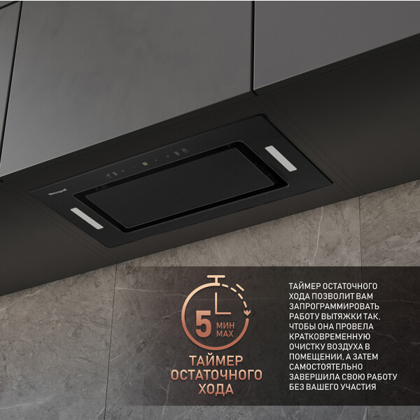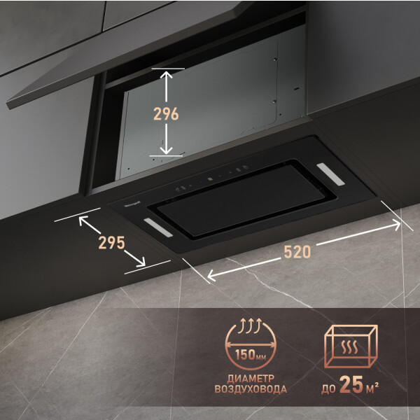 Дизайн врезной блок дает возможность полностью встроить вытяжку в верхний навесной шкаф, что сделает её практически незаметной.