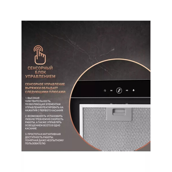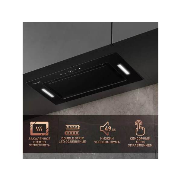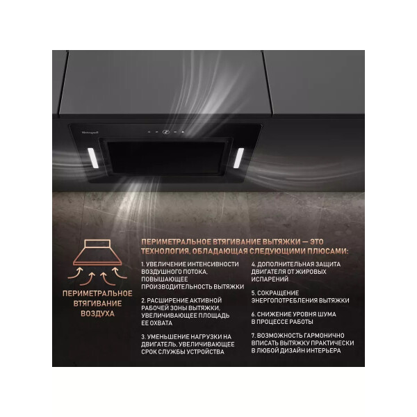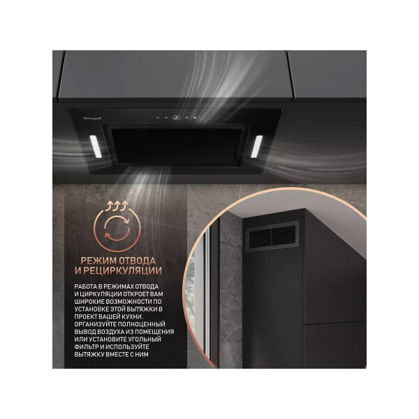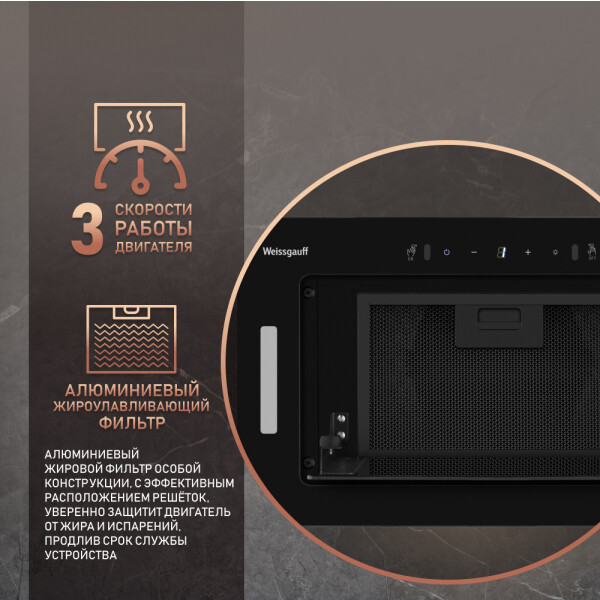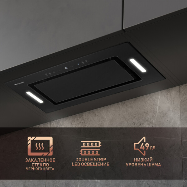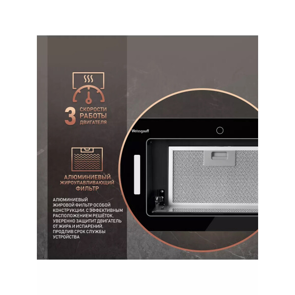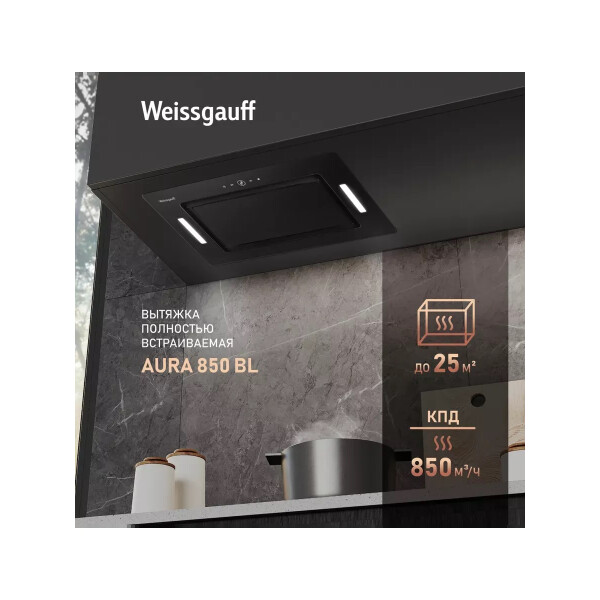 Поистине мощная вытяжка от Weissgauff серии PREMIUM, обладающая ураганной производительностью в 850 м3/ч и оснащенная сенсорным управлением, выполнена в дизайне врезного блока с панелью стильного черного цвета и справится со своей задачей даже на самой большой кухне!