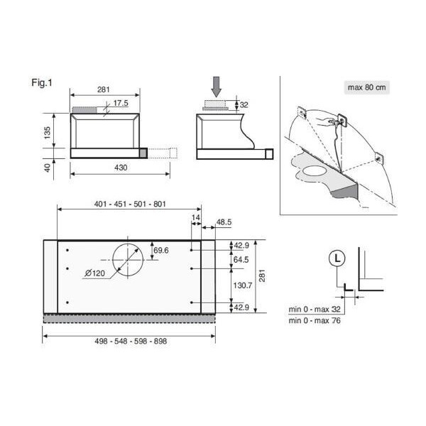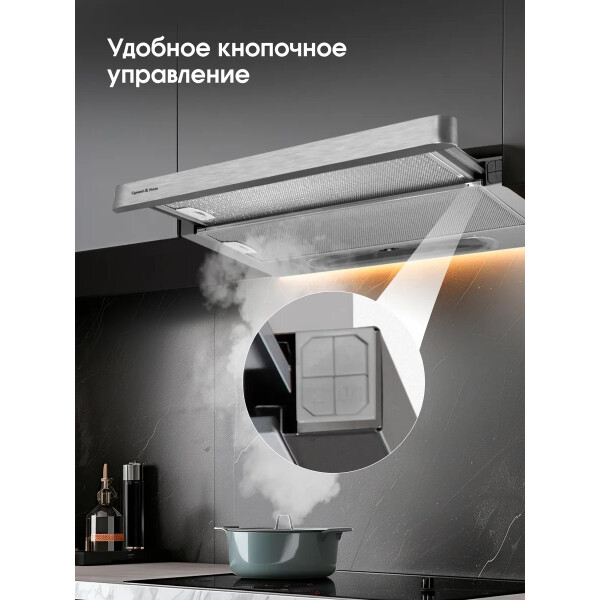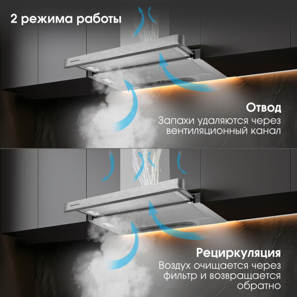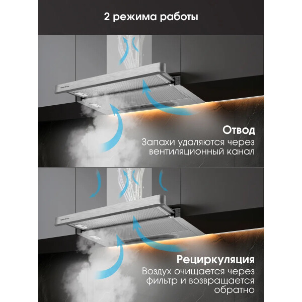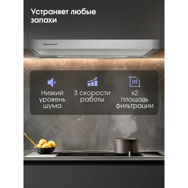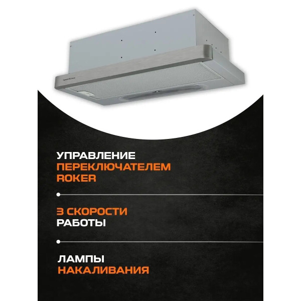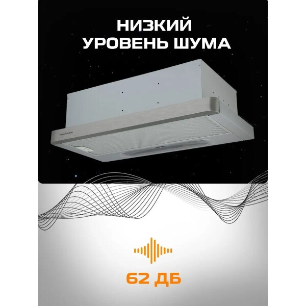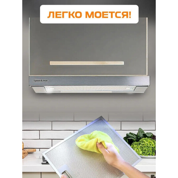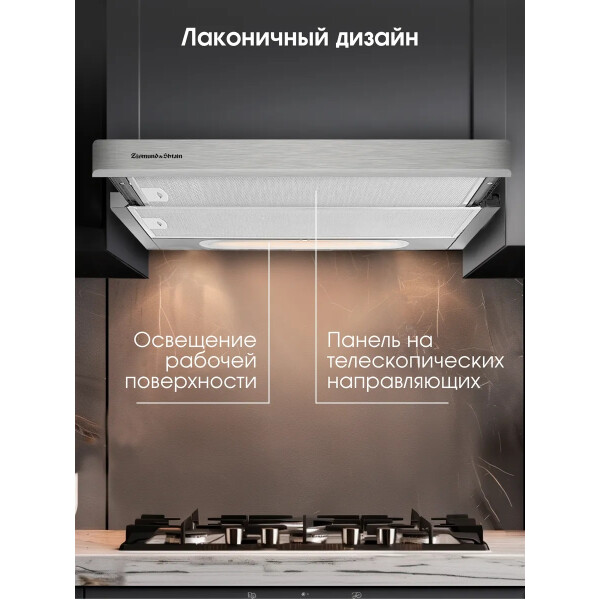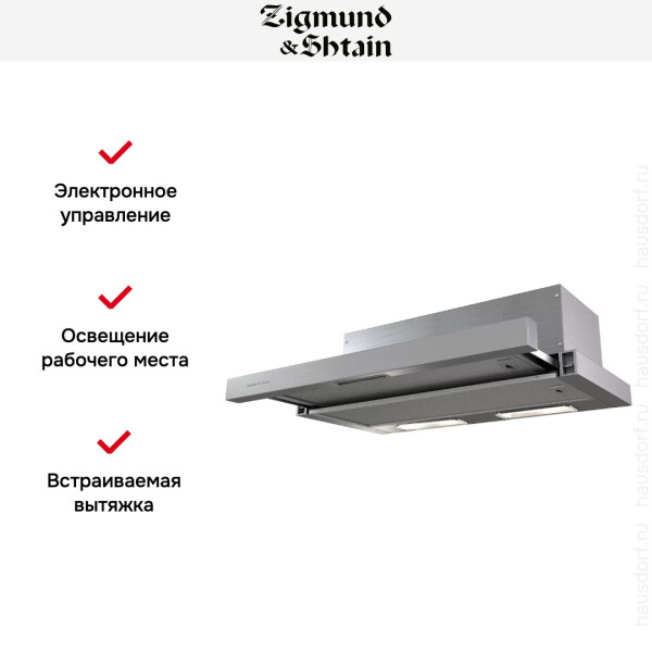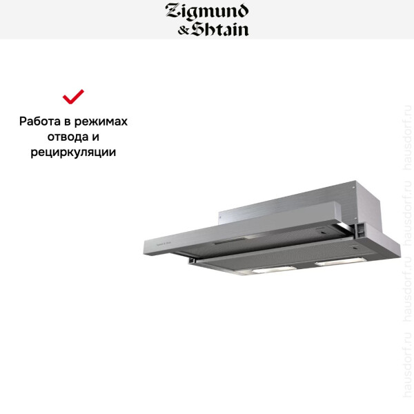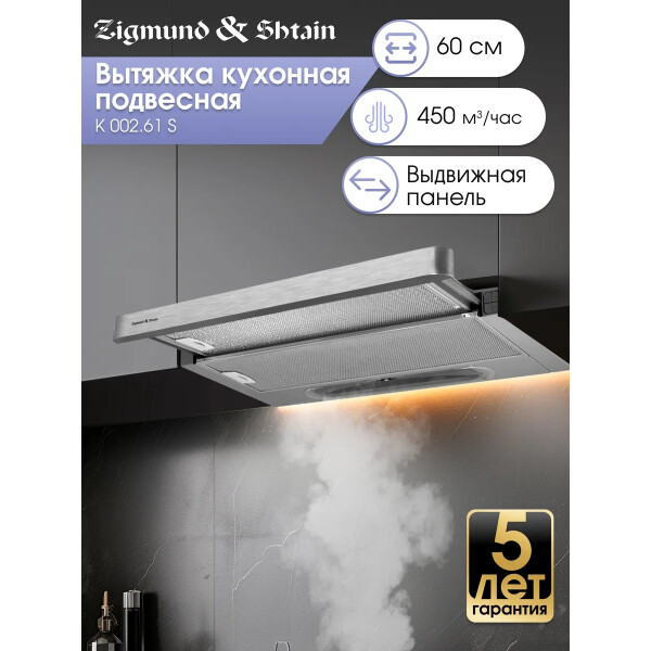 Zigmund & Shtain K 002.61 S может работать на двух скоростях. Управление устройством можно производить с помощью тактовых переключателей. Работает вытяжка относительно тихо, уровень шума не превышает показатель 55 дБ. В конструкцию встроены два источника света по 20 Вт.