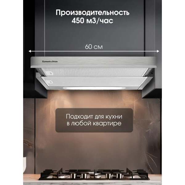 Вытяжка полновстраиваемая Zigmund & Shtain K 002.61 S произведена в серебристом цвете. Ширина встраивания для этой модели равна 60 см. Модель прочно крепится к стене, при работе ее мощность составляет 330 Вт. Устройство работает на отвод воздуха от плиты. Для этого предусмотрен воздуховод, диаметр которого равен 12 см. Встроенный жировой фильтр является дополнительным преимуществом представленной модели. Вытяжка работает с максимальной производительностью, равной 550 м воздуха в час.