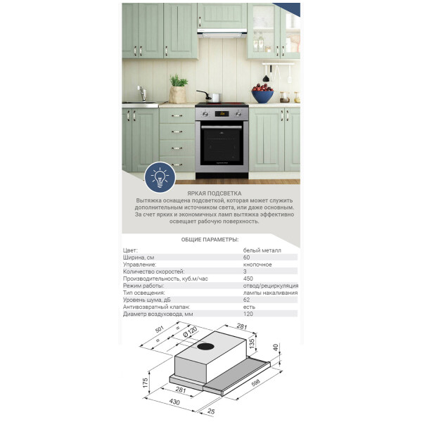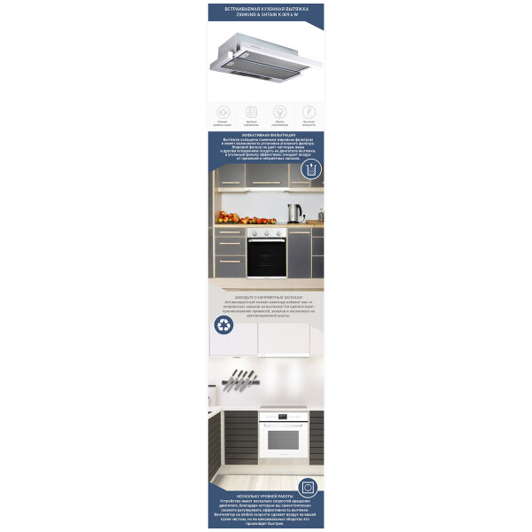 Встраиваемая вытяжка Zigmund & Shtain K 009.6 W белого цвета имеет 3 скорости, уровень шума на минимальной составляет всего 55 ДБ.