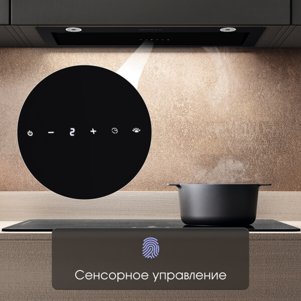 Посмотрите наверх и оцените яркий дизайн. Однако это не только вытяжка с выдающимся внешним видом, вы заметите весь ее потенциал. Модель выполнена элегантно и просто. Черное стекло с обработкой против отпечатков пальцев и чистые линии современного дизайна подойдут к различным типам кухни и создадут индивидуальный стиль.