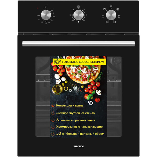 Встраиваемый электрический духовой шкаф Avex HM 4060 1B черного цвета отлично подойдет в вашу кухню. Предусмотрена электрическая независимая духовка. Температура нагрева духового шкафа от 50 до 250 С. Есть поворотные металлические переключатели. Есть следующие функции: гриль, механический таймер, вентилятор охлаждения, хромированные направляющие.
