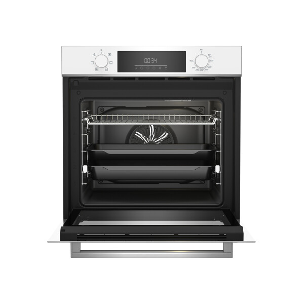 Встраиваемая духовка белого цвета имеет объем 72 л и удобное управление с поворотными переключателями, электронным таймером и блокировкой кнопок от случайного нажатия. Духовой шкаф предлагает 6 режимов работы, включая верхний и нижний нагрев, конвекцию и гриль. Дверца духового шкафа и имеет 2 стекла и не нагревается с внешней стороны. В комплекте с духовкой идут стандартный, глубокий противень и решетка.