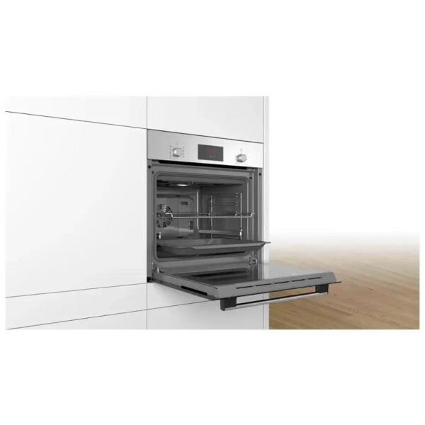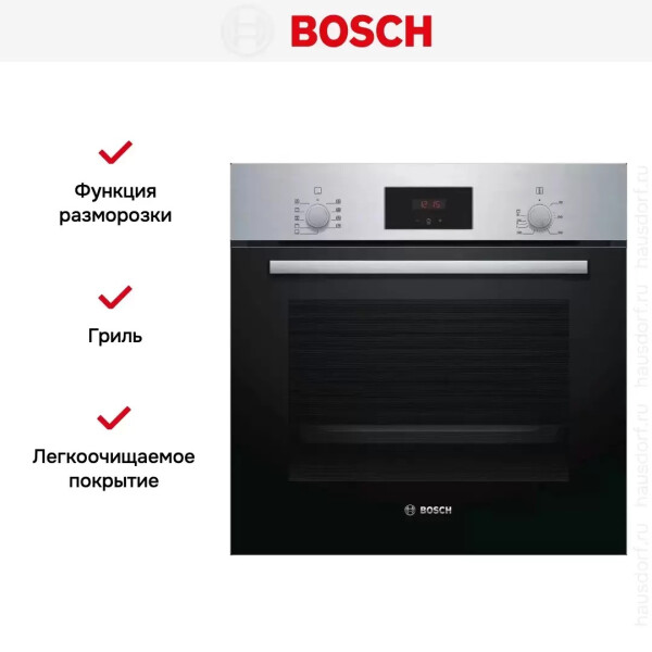 Духовой шкаф Bosch HBF114ES0R представлен в стильном сочетании стального цвета и черного стекла. Он отлично впишется как в современный, так и в классический кухонный интерьер.