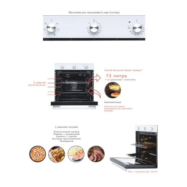 Функционал:Верхний и нижний нагрев с конвекцией обеспечивают постоянный приток тепла, что позволяет выпекать сразу несколько блюд одновременно. Механические управление Classic Control интуитивно просто и понятно в использовании. Верхний нагрев подходит для печенья.