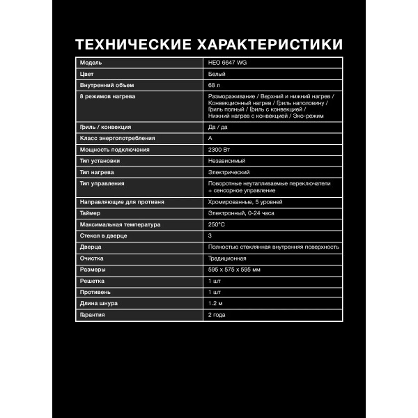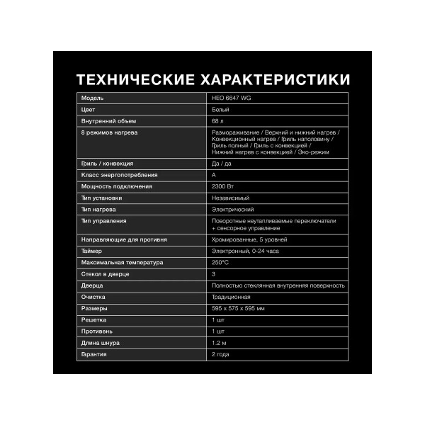 Духовой электрический шкаф HEO 6647 WG является независимым поэтому устанавливайте его на кухне там, где Вам это будет максимально удобно и по местоположению, и по высоте.