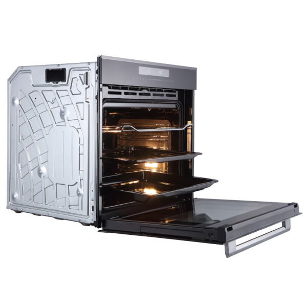 Тройное остекление дверцы Специальные материалы стекла обладают свойствами защитного экрана, удерживающего тепло внутри камеры, а конструкция дверцы с применением трех стекол позволяет снизить температуру фронтальной поверхности до минимума. Все это снижает потребление электроэнергии и делает приготовление полностью безопасным.
