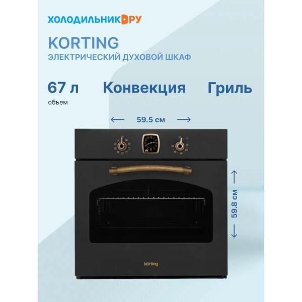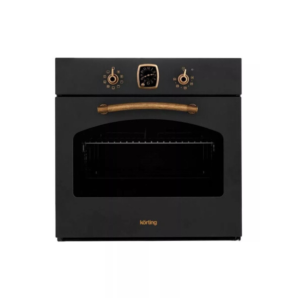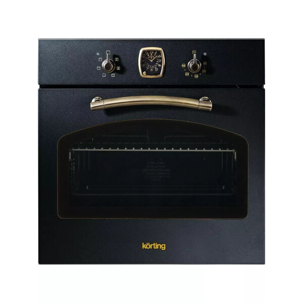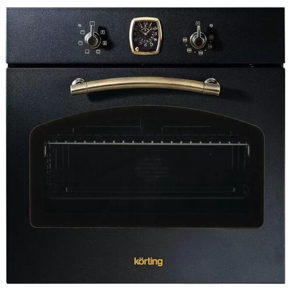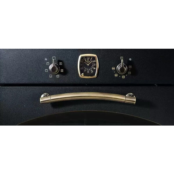Духовой шкаф в стиле ретро станет изящным дополнением кухни. Бронзовая фурнитура подчеркивает элегантный дизайн черного духового шкафа. Панель управления оснащена аналоговыми часами в дизайне Franck Muller. Таймер и автоматическое отключение сделают использование этой модели простым и комфортным. Шесть режимов нагрева помогут создать любое блюдо. В комплекте идут два противня и хромированная решетка.